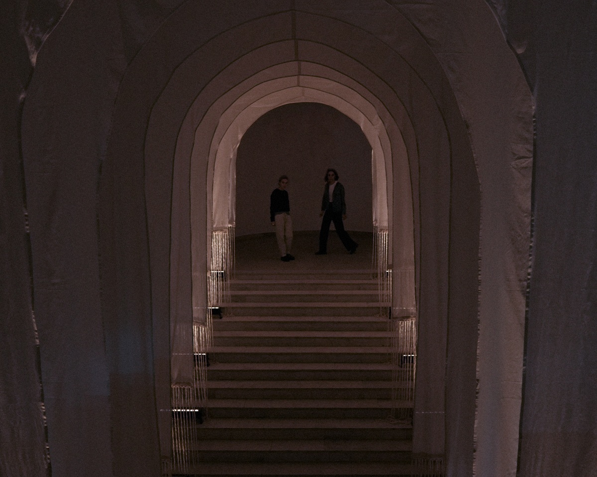 Ինստալացիան կառուցված էր բնական գործվածքներից ու հյուսված շերտերից, որոնք հատակից բարձրանում էին ոչ թե որպես դեկոր, այլ որպես գործընթաց՝ հիշեցնելով, որ Հայաստանի բրդյա ավանդույթը ժամանակի ընթացքում ոչ թե մաշվել է, այլ շարունակել է վերածնվել։ Թելերն աստիճանաբար միաձուլվում էին և վերևում ընդունում հայկական ավանդական կամարի ձևը։ Սա պարզ գեղագիտական ժեստ չէր․ այն շեշտում էր այն միտքը, որ ճարտարապետությունը, ընդհանրապես կառուցումը, պիտի ծագի բնության ներքին կազմակերպվածությունից, իսկ ոչ հակառակն։