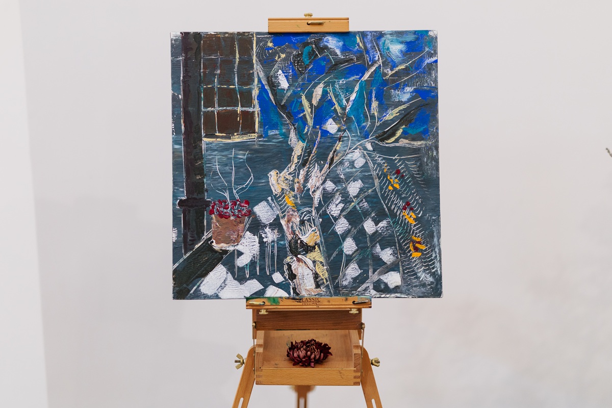 Մոլբերտի վրա Լիլիթ Հարությունյանի վերջին կտավն է՝ անավարտ ու անվերնագիր․ պատերին՝ նկարչուհու տարբեր տարիների աշխատանքները։