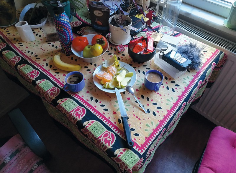Մեր էպիզոդը սկսվելու էր ֆեյսբուքյան քննարկումից մի քանի հատված ընթերցելով, որի համար մեզ տղայի ձայն էր պետք։ Ինչպես ասում են՝ դե արի էս նեղ մաջալին հայերեն, էն էլ արևելահայերեն խոսող տղա գտի, խոսացրու ու ձայնագրի։ Բարդ էր, մտքով անցանք բոլոր ծանոթների անուններով։ Չգտանք։ Նամակ գրեցինք Արեգին Առաքելյան, ուղարկեցինք տեքստը, խնդրեցինք ձայնագրել ու ուղարկել։ Ըհըն։ Սլյեդույշչի՜հ։ Հերթը հասավ մեր բուն տեքստի ձայնագրմանը։ Գոհարի գնալուն քիչ ժամանակ էր մնացել, երևի մի չորս ժամ։ Պետք էր արագացնել։ Գնացինք ներքին բակի կողմում գտնվող սենյակը, որը մեր ընկերուհի Վարդուհու ննաջարանն էր։ Կատվին վտարեցինք սենյակից, դուռը պինդ-պինդ փակեցինք, աղոթողների պես ծնկեցինք մահճակալի մոտ, որ ձայնագրման միջավայրը փափուկ լինի, ձայնագրիչը դրեցինք մեր մեջտեղում ու սկսեցինք խոսել։ Մեր խոսքը մերթընդմերթ ընդհատվում էր վերևի հարևանների աղմուկ աղաղակով, որը ճանճի տզզոցի պես լսվում էր ու մեր արագ-արագ կարդալ վերջացնելու տրամադրվածությանը նյարդայնություն բերում։ Ազնիվ հավատացյալների պես ծնկի ցավերից պարբերաբար փոխում էինք մեր դիրքը ու տընքտընքում։