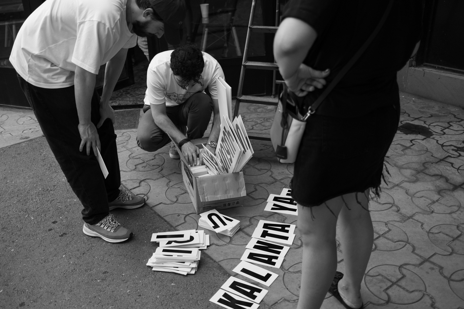 Մի քանիսը ներքևում պատրաստում են բառերն ու մասնակիցների անունները, Էդոն վերևում ընդունում է արդեն խմբավորված տառերը, հները հանում, նորերն ամրացնում: Պատմում է, որ ցուցանակն իր պնդմամբ են տեղադրել, քանի որ կարծիք կար, որ ամեն օր հանել-դնելը դժվար կլինի։ Բայց ցանկությունն այնքան մեծ էր, որ համաձայնվել է պրոցեսն ամեն օր անձամբ ստանձնել, մենակ թե ցուցանակն իրականություն դառնա։ Հարցնում եմ՝ խոստումից չի՞ փոշմանել։ Ծանր աստիճանը մի կերպ դուրս հանելով՝ ժպտում է, ժպիտ, որը մոտավորապես նշանակում է՝ «փոշմանելուն մոտիկ եմ, բայց պարզ ա, որ երբեք բարձրաձայն դրա մասին չեմ ասի»: