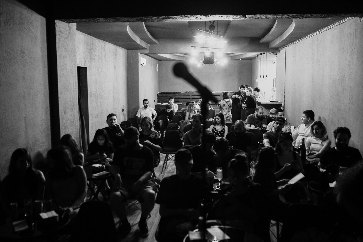 Լույսերն անջատվում են, սենյակը մթնում է այնքան, որ ինքդ քեզ էլ չես տեսնում, խոսակցությունները դառնում են շշուկ, բեմին վառվում է միակ լույսը. լույսի եռանկյունն ուղիղ այնքան է, որ մեջը ներգծված տեղավորվի բռնակի վրա ամրացված խոսափողն ու տղան: Երևի տետրի մեջտեղի մասից պոկած, արդեն մի քիչ ճմռթված ու կյանք տեսած թղթիկը ձեռքին, մի քիչ խառնված, մի քիչ ամաչած… Խորը շունչ, ու… սկսեցինք: