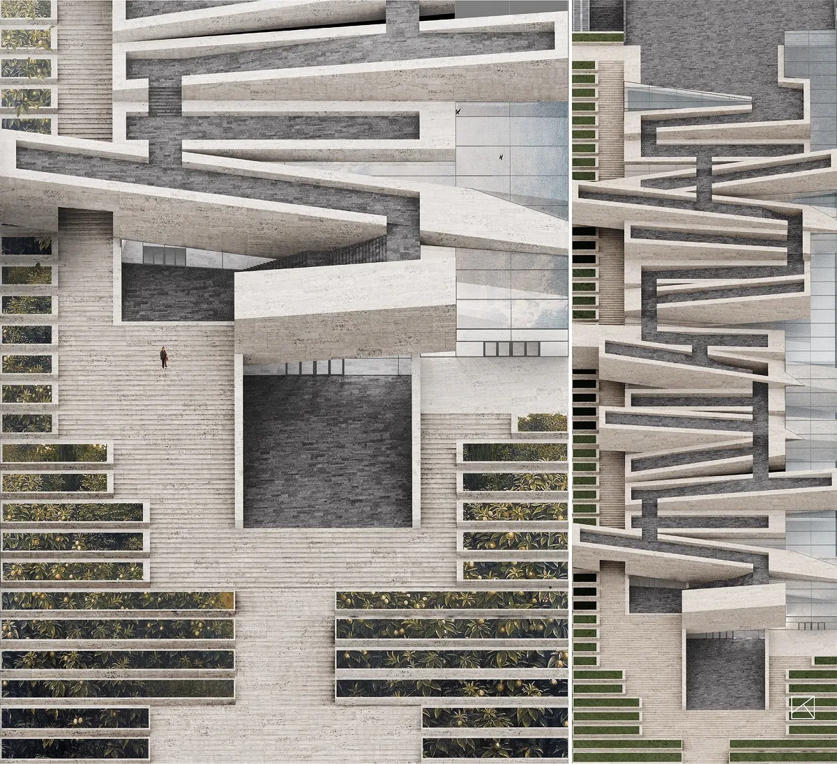 Ըստ նախագծի, շինությունն ունի երեք մակարդակ․ ստորին հարկերում տեղակայված է համերգասրահ 2000 հանդիսատեսի համար, որն ունի երեք մուտք (դիտահարթակի վրայից, Սարալանջի փողոցի կողմից, Կասկադի աստիճանների և շարժասանդուղքների վրայից): Երկրորդ մակարդակում՝ ուղղանկյուն ծավալների մեջ շարունակվում է թանգարանը, իսկ վերին մասում՝ զիգզագաձև ճեմուղին է, որը կասկադի աստիճանները կապում է գոյություն ունեցող դիտահարդակի հետ: Ձախ հատվածում կասկադի գոյություն ունեցող աստիճանները և ստորգետնյա շարժասանդուղքները շարունակվում են մինչև վերևի դիտահարթակ, տալով հնարավորություն ավելի արագ տեղաշարժվել: