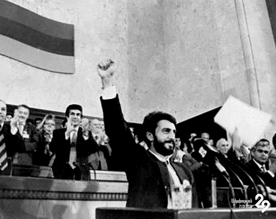 37․ Ինչպես 90-ի օգոստոսի 23-ի հռչակագիրը, այնպես էլ այս որոշումը Արամ Մանուկյանին հանձնարարելը խորհրդանշական կապ էր ստեղծում Առաջին հանրապետության հետ։ Եռագույնն արդեն օրենքով հաստատված էր (24.08.90 թ), իսկ ՀՀ օրհներգն ու զինանշանը հաստատվեցին հաջորդ տարիներին՝ նույն տրամաբանությամբ։