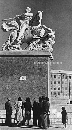 Այդ ժամանակ Երվանդ Քոչարը նոր էր վերադարձել Փարիզից, և հենց նա էր, որ հանձն առավ իրականացնելու այդ աշխատանքը՝ դրա համար պահանջելով միայն մի քանի օգնական: Փայտե մի քանի մետրանոց պատվանդանին Սասունցի Դավթի գիպսե արձանը պատրաստ էր 18 օր անց: Արձանը տեղադրվեց կայարանամերձ հրապարակում և այնտեղ մնաց շուրջ 2 տարի՝ մինչև վարպետի ձերբակալումը: Քոչարին ներկայացված մեղադրանքներից մեկն այն էր, որ «մերկացրած սրով հեծյալը սուրում է դեպի «բարեկամ» Թուրքիա…», նրան մեղադրեցին ֆորմալիզմի մեջ, ինչը հավասարազոր էր «ժողովրդի թշնամի» կոչվելուն, բանտարկեցին, իսկ արձանը ոչնչացվեց: 2 տարի և 2 ամիս բանտում անցկացնելուց հետո վարպետին ազատ արձակեցին հանցակազմի բացակայության հիման վրա: 1957-ին, երբ Քոչարն արդեն ճանաչված ու հարգված էր թե՛ արվեստագետների ու արվեստասերների, թե՛ հասարակ ժողովրդի ու իշխող շրջանակների կողմից, Երքաղսովետը նրան վերստին հանձնարարեց Սասունցի Դավթի արձան կերտել, որն էլ մինչև օրս տեղադրված է վերոհիշյալ հրապարակում: