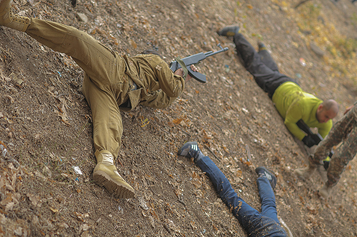ՈՄԱ-ում պատրաստություն անցնող երկրորդ խումբը տակտիկական վարժություններ էր անում փայտե մուլյաժ հրացաններով զինված։ Մեզ նույնիսկ չնկատեցին, թվաց՝ անտեսանելի ենք դարձել։ Հեռվում մեկ այլ դասընթաց էր, առանց կտրուկ գործողությունների։ Բուժական գործն էր, առաջին շտապօգնությունը։ Կենտրոնում գետնին կամավոր էր պառկած, որին է՛լ վիրակապեցին, է՛լ շրջեցին ու ոտքերից բռնած տարան, է՛լ այրվածքը բուժեցին, է՛լ տեղափոխեցին պատգարակի վրա։