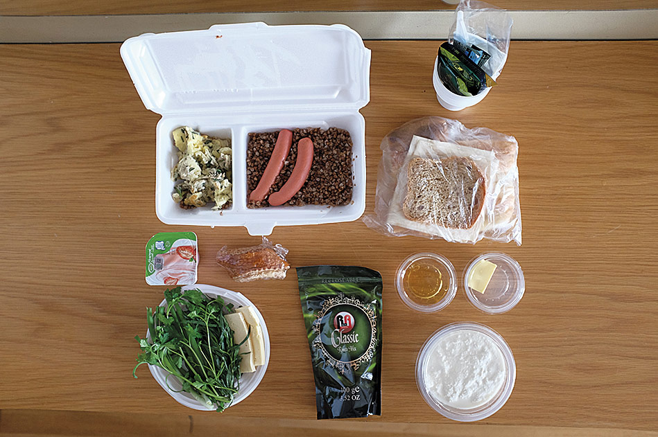 «Կառանտին., օր 1։ Ճիշտն ասած, բացարձակ պարզ չի՝ ոնց ենք սենց դիմանալու 14 օր, բայց ոչ էն պատճառներով, որոնցով կարելի էր ենթադրել։ Ահա, խնդրեմ, մի հոգու նախաճաշը։ Ափսոս ռակուրսի պատճառով չի երևում հացի քանակը ու մի քիչ անտեսված ա յոգուրտը, մեղրն էլ մի քիչ ձեթի նման ա (նկարում միայն), կաթնաշոռ/թթվասերն էլ, շաքարի, սուրճի, թեյի տարբերակներն էլ չեն երևում...