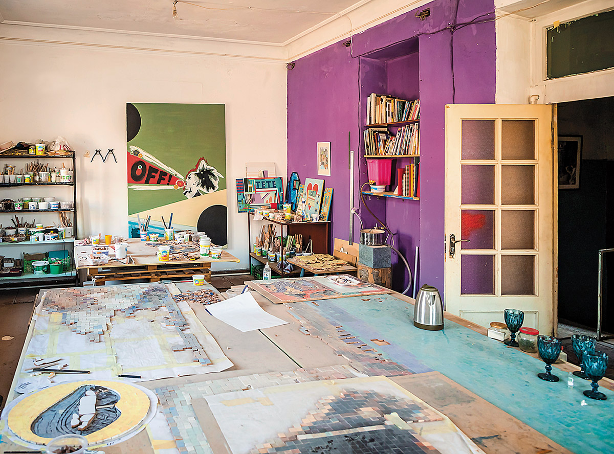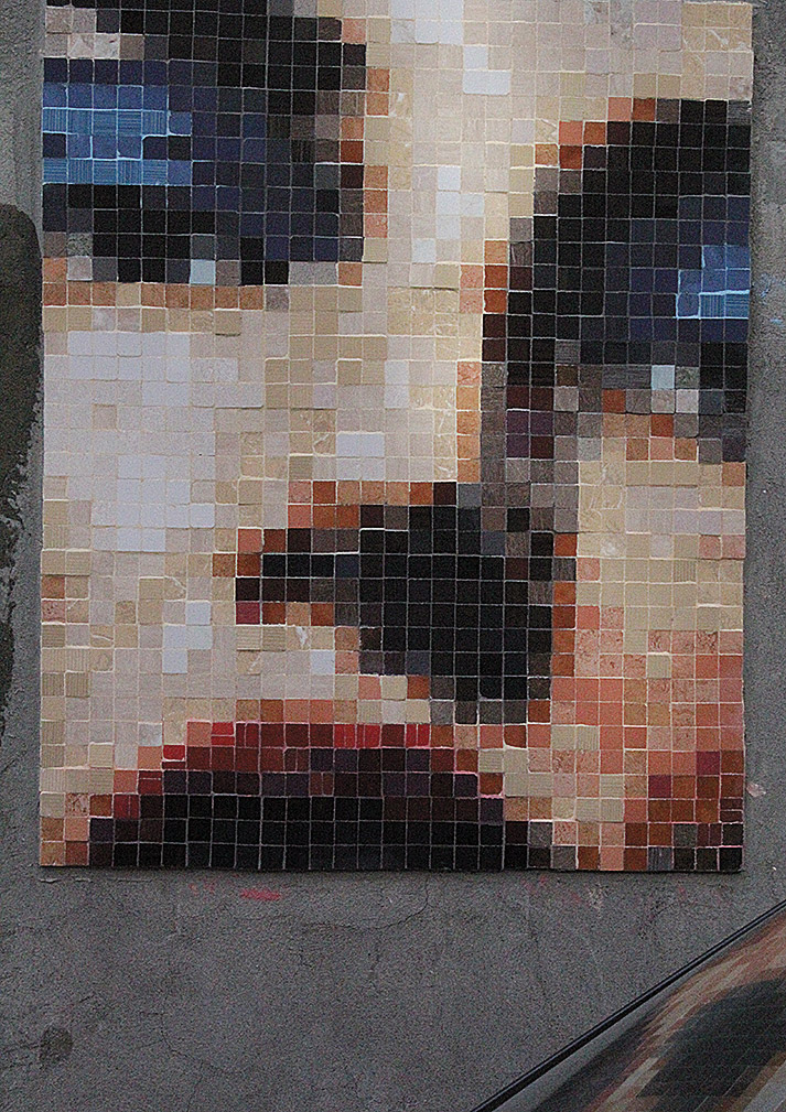 Ամեն անգամ խճանկարների կողքով անցնելիս մտածում էի, թե տեսնես ո՞վ է հեղինակը։ Պարզվում է՝ Սիրանուշ Աղաջանյանն է, ում երեք տարի շարունակ հաջողվել է գրեթե աննկատ մնալ։ Սիրանուշի հետ հանդիպեցի իր արվեստանոցում։ Ֆիրդուսի բակում գունավոր սփրեյներով ներկված դարպասները միանգամից տարբերվում են շրջակա միատոնության մեջ։ Դարպասից ներս շատ անհասկանալի հատակագծով մի շինություն կա, որի երկրորդ հարկում էլ նկարչուհու արվեստանոցն է։ Երևանի հերթական արվեստանոցային գողտրիկ անկյուններից է։ Պիտի ոստովանեմ, որ արվեստանոցի համար այն բավական կոկիկ է դասավորված։ Կենտրոնում դրված ընդարձակ սեղաններին սալիկի փոքրիկ ուղղանկյուն կտորներ են շարված, որոնց կազմած պատկերում արդեն իսկ կարելի է ինչ-որ բան նշմարել։ Դրանց մի մասն էլ դեռ չունի իր հստակ տեղն ու լցված է տարբեր տարաների մեջ։