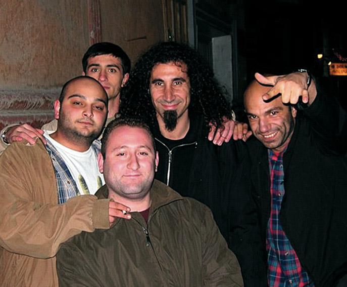 Հետո՝ Toxicity-ն նոր էր դուրս եկել, իմացանք, որ Սերժ Թանկյանը, Շավոյի ու իրանց պրոդյուսերի հետ գալիս են Երևան։ Կարծեմ Սերժն առաջին անգամ էր ընդհանրապես, դե Շավոն երևանցի էր, իրա համար բացահայտում չէր։ Բայց գլխավոր նպատակը ստեղի ֆանատներին տեսնելն էր, մի քիչ էլ անկախ Հայաստանը տեսնել։ Աբովյանում տուն էին վարձել՝ հիմիկվա կաֆե «Ցենտրալի» շենքի երկրորդ հարկում։ Մեզ մի քանի հոգով գտան, կանչեցին։ Ես էլ որպես Սիսթեմի պատվավոր ֆանատ դրանց թվում էի։ Ահագին նստեցինք, Սերժը վերջին մի 15 րոպեն մտավ, սաղիս ողջունեց, լավ-լավ բաներ ասեց, նկարվեց, ու գնաց։ Իսկ ես էն տարիքում էի, որ սիրած աստղին հանդիպելը շատ մեծ բան էր։ Ֆոտոն ունեմ պահած։ Հետո մի քանի անգամ էլ գնաց եկավ ու կար մարդկանց մի շրջանակ, որոնք իրան գիտեն այ էդ ժամանակներից։