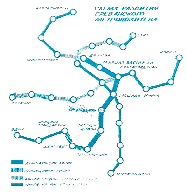 1981 թվականի մարտին «գերազանց» գնահատականով շահագործման հանձնվեց Երևանի մետրոպոլիտենի «Բարեկամություն» կայարանից մինչև «Սասունցի Դավիթ» կայարանի հատվածը, երկու տարի անց կայացավ «Գործարանային» կայարանի և ուղեհատվածի գործարկումը, 1986-ին շահագործման հանձնվեց «Շենգավիթ» կայարանը, և գնացքների ճանապարհը ավելացավ ևս 1,7 կմ-ով: «Բարեկամություն» կայարանից մինչև «Շենգավիթ» ուղևորները հնարավորություն ստացան անցնել 12-15 րոպեում: 1987 թվականի հունվարի 5-ին շարք մտավ Երևանի մետրոպոլիտենի առաջին հերթի վերջին ծայրամասային «Գարեգին Նժդեհի հրապարակ» կայարանը: Արդեն մետրոպոլիտենի գնացքները երթևեկություն կատարեցին «Բարեկամություն» կայարանից մինչև գծի վերջին կայարանը՝ այդ ճանապարհն անցնելով ընդամենը 17 րոպե 30 վայրկյանում: 1988 թվականին Աջափնյակի «Արագած» կինոթատրոնի մոտակայքում Հալաբյան-Աբելյան փողոցների խաչմերուկի շինհրապարակում դրվեցին երևանյան ստորգետնյա մայրուղու երկրորդ հերթի շինարարության հիմքերը: Նախատեսված էր 1990 թվականի մետրոյի «Բարեկամություն» կայարանից գնացքը հանել Հրազդանի գեղատեսիլ կիրճը, հասցնել մինչև Աջափնյակում կառուցվող երկու կայարանները, որոնց միջև ընկած հեռավորությունը 1500 մետր էր (ուշադիր անցորդը մինչ օրս կարող է Կիևյան կամրջով անցնելիս նկատել կիրճի լանջին թունելի երկու անցք, որոնք, սակայն, այդպես էլ չօգտագործվեցին):