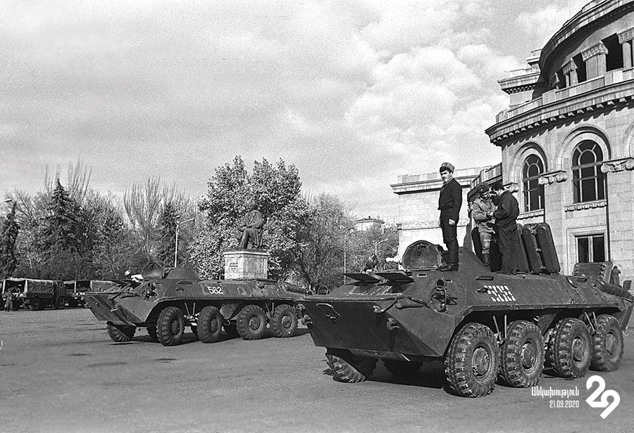 Օպերայի մոտ էինք ապրում, հենց այստեղ սովետական բանակի զինվորներ էին տանկերով։ Մենք երեխա էինք, մեզ ամենուր թողնում էին մտնել։ Խցկվում էինք, գնում, շփվում էինք զինվորների հետ։ Հայ չէին, ընդամենը 18 տարեկան տղաներ էին։ Իրենց մածուն էինք տանում, դրա փոխարեն մեզ գիլզաներ կամ նույնիսկ հակագազ էին տալիս։ Անգամ թողնում էին տանկի մեջ մտնել։