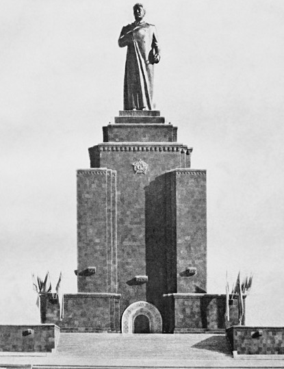 Բրոնզ և գրանիտ: Բարձրությունը՝ 7,5 մետր: Քանդակագործ՝ Սերգեյ Մերկուրով, ճարտարապետ՝ Լևոն Վարդանյան: Կանգուն տարիներ՝ 1940–1991 թթ.: Վայրը՝ Լենինի (այժմ՝ Հանրապետության) հրապարակ: