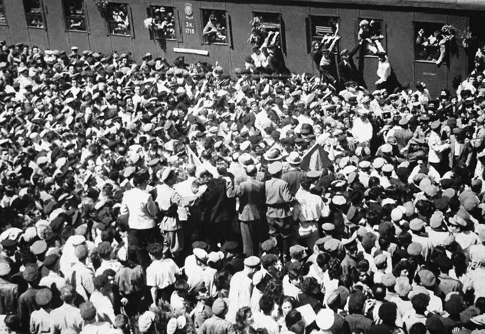 Առաջին հայրենադարձներին դիմավորում են Երևանի երկաթուղային կայարանում, 1948թ.